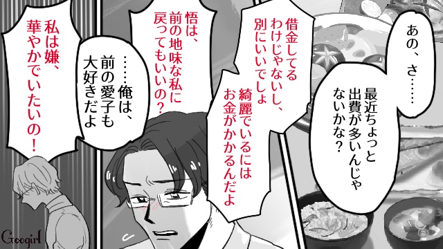 真理との出会いで、ブランドやクラブに夢中になってしまった愛子。夫の悟に一緒に行こうと誘いますが、悟は気分が乗らない様子。こうして少しずつ夫婦の価値観の違いが浮き彫りになっていき……。