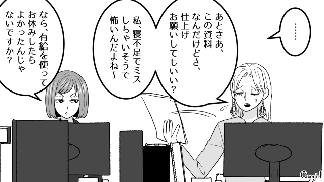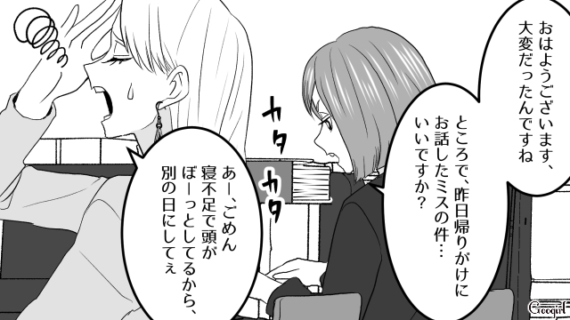 信じがたい嘘の数々に衝撃を受けながらも、里美は工藤課長と共に反撃の準備を進めることにしました。そんな計画も露知らず、翌朝、絵里奈は何食わぬ顔でオフィスに現れます。そして、今日も仕事をさぼる言い訳をあれこれと並べ始めるのでした。