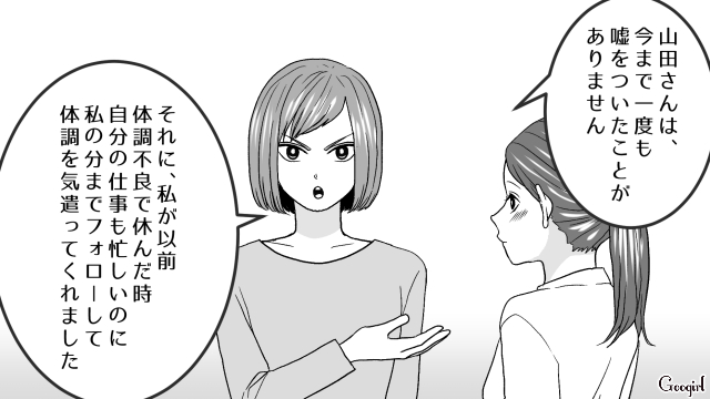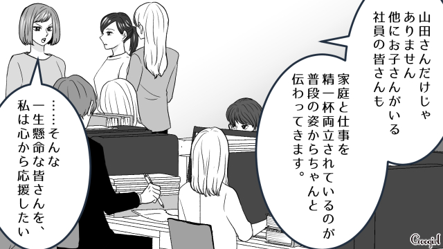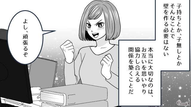 ▽ 山田さんを快く送り出した里美に対し、「贔屓だ!」と騒ぎ立てる絵里奈。しかし里美は、「嘘つきは誰からも助けてもらえない」と絵里奈を一喝します。何も言い返せず孤立する絵里奈を尻目に、里美は「子持ちと子無しで壁を作るのではなく、協力し合える職場にしたい」と前を向くのでした。絵里奈にもこれからしっかり反省してほしいですね。最後までお付き合いくださり、ありがとうございました!