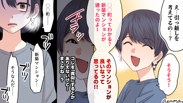 その後も私の真似はどんどんエスカレートしていき、恐怖を感じるレベルに……。『引っ越しを考えてる』『〇〇町がオシャレでいいよね』『最近そこにできた新築マンションを狙ってるの』と試しに言ってみたら、ママ友は本当にそのマンションへと引っ越していきました。よく旦那さんが許したな……。もちろん、私は引っ越す気なんてさらさらありません(笑)。