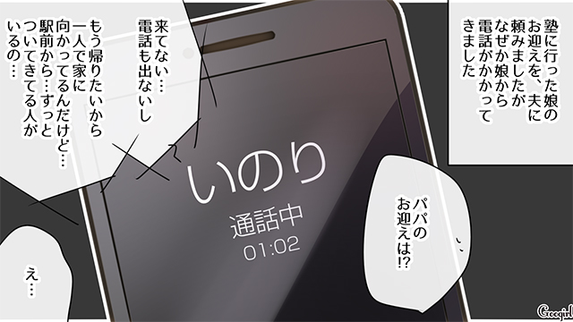 娘がいる親にとって、防犯は大きな問題ですよね。でも男親だと、いまいち防犯意識が薄かったりすることも、よくあるケースです。その結果、もし娘が危険な目に遭ってしまったら……? 絵里と則男は娘を持つ夫婦。でも則男は娘に関する防犯意識がいまいち薄いタイプです。中3になった娘の塾のお迎えもすっぽかしてしまい、その結果……。