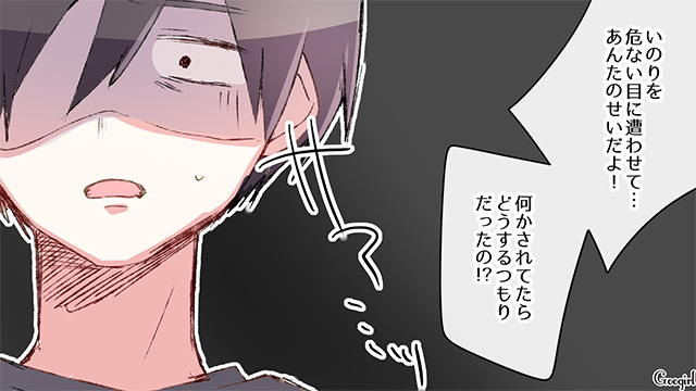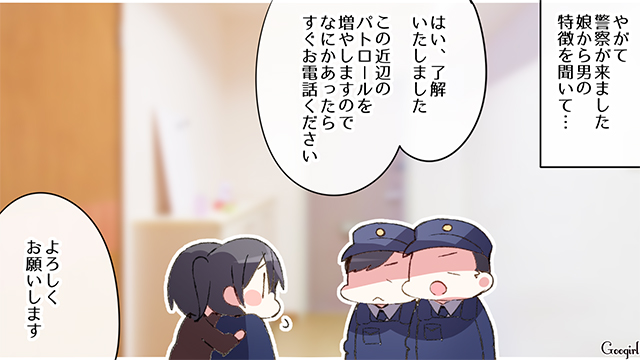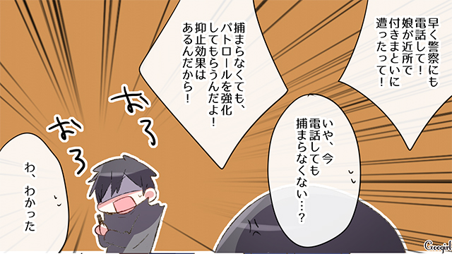 娘がいる親にとって、防犯は大きな問題ですよね。でも男親だと、いまいち防犯意識が薄かったりすることも、よくあるケースです。その結果、もし娘が危険な目に遭ってしまったら……? 絵里と則男は娘を持つ夫婦。でも則男は娘に関する防犯意識がいまいち薄いタイプです。中3になった娘のいのりのお迎えもすっぽかして、その結果、いのりは付きまといに遭ってしまい……。