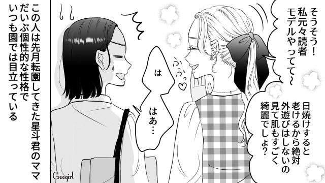 主人公・遙香は幼稚園に通う4歳の息子を育てるお母さん。ある日、幼稚園の参観に参加した遥香は、そこで最近転入してきた派手なママ友・麗子と出会う。麗子は自分の美貌をやたらとアピールする厄介なタイプの女性で……!?