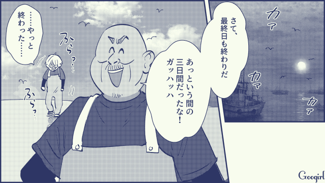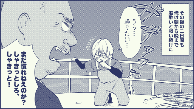 五郎に連れてこられたのはまさかの漁船。船酔いでダウンしながらもなんとか初日を耐え抜いた隆司でしたが、五郎からは「あと2日あるぞ!」と笑顔で告げられて……。さて、無事に乗り越えることができるでしょうか?