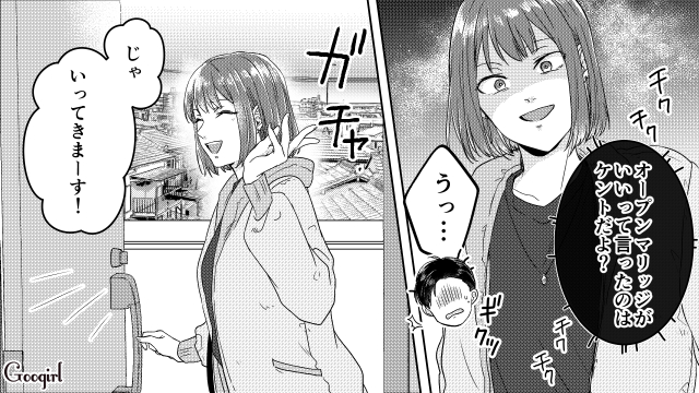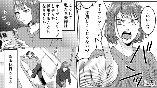 近年、様々な価値観の広がりとともに注目されている「オープンマリッジ」。夫婦がお互いの合意のもとで、結婚後もパートナー以外の人との恋愛や性的な関係を許容し合う、新しい形の結婚スタイルですが、夫婦間のトラブルに発展することも……。今回はオープンマリッジを希望する夫に対し、男友達とデートして手を繋いだ妻のエピソードの第3話をご紹介します!