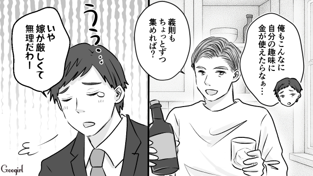 結婚して10年、仕事終わりのビールしか楽しみがないと嘆く義則。家族と楽しもうとしても却下され、趣味にお金を使うことすら牽制され、月3万円の小遣いにも物足りなさを感じる日々。そんなある日、久しぶりに再会した親友の孝太郎は、まさに義則の理想の高級時計を身につけ、いい車で現れて……?
