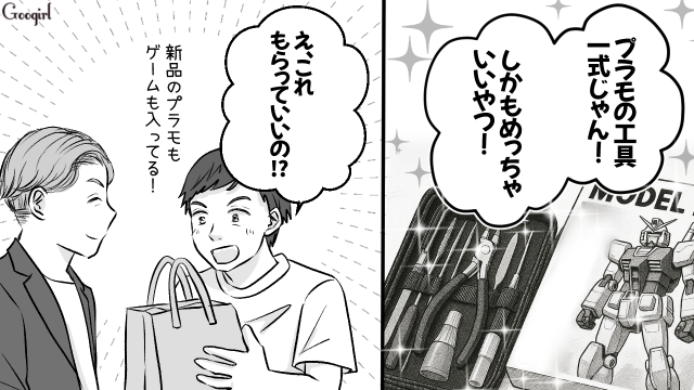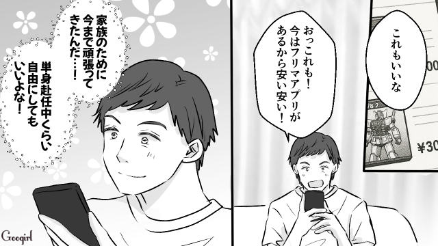▽ 単身赴任先で念願の一人暮らしを始めた義則は、自由を謳歌していました。たまたま孝太郎の家も近く、引っ越し祝いには新品のプラモデルや工具セット、ゲーム機までもらい、これからの生活に期待を膨らませていました。これまで抑えてきた物欲も爆発し、「今まで頑張ってきたご褒美だ」と言い聞かせながら、フリマアプリで次々に買い物を楽しんでいますが……。