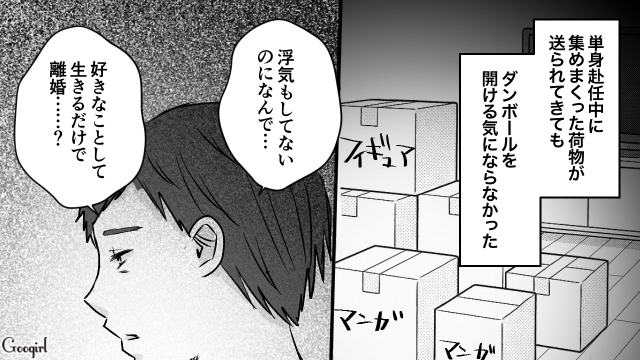 単身赴任を始めて3か月。義則は一度も帰省せず、休日は趣味三昧! 義則の1年の単身赴任が終わる前に、充分な収入を得られるようになった里奈は義則に離婚届を叩きつけます。引っ越しが終わり出て行く里奈たち。現実を受け止められない義則は、子どもたちだけでも家に残らせようとしますが、逆に心がしっかり離れている現実を突きつけられてしまいました。