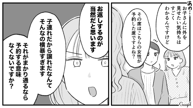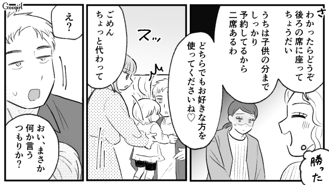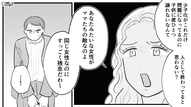 他人の指定席に勝手に座り、「子供を優先するのは日本人の義務!」と言い放った京香。子連れモンスター様の爆誕です。
