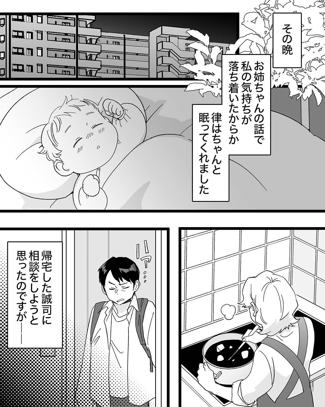 ▽ 姉が来てくれて本当に良かったですね。初めての育児でひとりぼっちはとてもつらいものです。それにしても、寝ぐずりしていた赤ちゃんが、他の人に抱っこされると急に機嫌が直るあの現象……なんなのでしょうね。