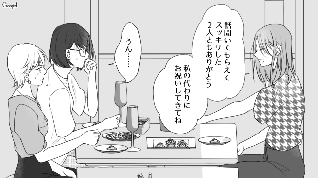 親友・志保の彼氏である三春に思いを寄せ、転職までして近づいた立花。志保と別れた三春は、すぐに立花との同棲を始めます。幸せな日々を送る一方で、志保とは音信不通のまま。半年後のプチ同窓会で再会した立花は志保に結婚式への参加と友人代表のスピーチを頼みます。裏切ったのは立花なのに、志保との友情を疑わない姿に、三春も驚きますが、立花は友達なら祝ってくれて当然としか思っていなくて……。
