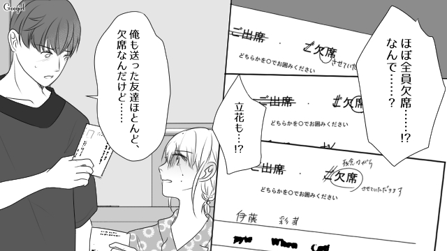 ▽ 結婚式の招待状、返事は欠席ばかり。三春も友達の健人から話が回り、ほとんどの人が参加できないことがわかりました。でも、志保が話したのは、大学の友達だけ。立花の小中学校時代の子たちまで欠席をするなんて、いったいどういうことでしょうか?