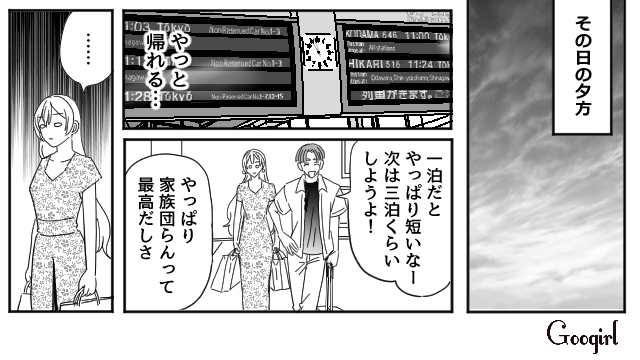 亮介の実家でクタクタになった優子は、やっとひとりホテルへと逃げ込みます。誰にも愚痴を言えず、モヤモヤを抱えたまま迎えた帰省2日目。迎えに来たのは、当然亮介ひとりではありませんでした。