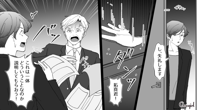 拓真の数々の不誠実な行いを知った美織は、父・俊一にすべてを打ち明けます。証拠を突きつけられた俊一は激怒し、拓真を呼び出しました。