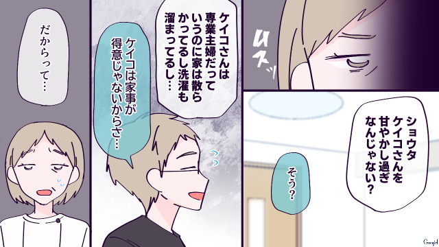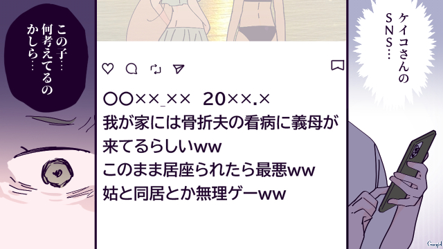 ▽ ショウタはケイコにゾッコンで甘やかし過ぎてしまっているようですね。お義母さんもショウタの扱いを考えるともっと強く言ってやりたいところでしょう……。ケイコの悪口とも言える投稿を見て、ショウタもお義母さんも怒りが込み上げているようで……?