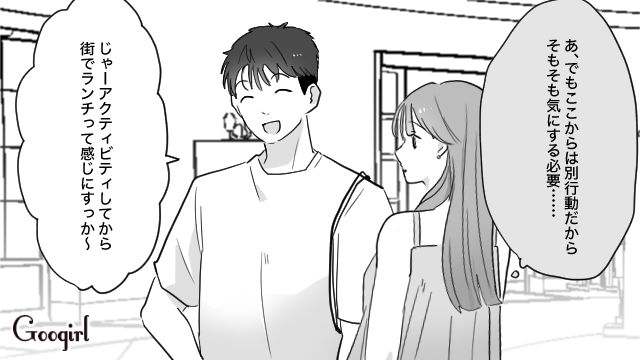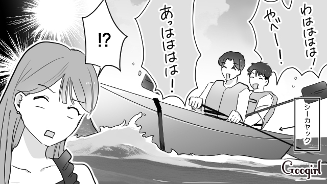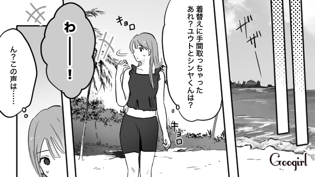 ▽ 現地では別行動をするはずだったのに、気づけば当然のように3人で一緒に行動する流れになっていたユウトとシンヤ。反対しようとしたリイコでしたが、友達を思うユウトの気持ちを尊重しようと、今日は3人で楽しもうと気持ちを切り替えました。ところが、水着に着替えてビーチへ向かったリイコの目に映ったのは、2人だけでシーカヤックを楽しんでいるユウトとシンヤの姿でした。
