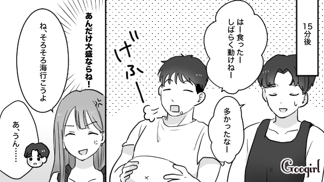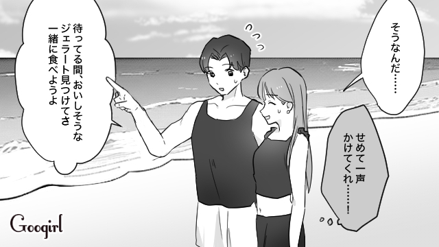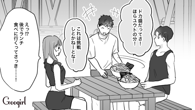 ▽ ジェラートを食べようとユウトが誘ってくれた直後、シンヤが大盛ラーメンを2つ抱えて現れました。「まだランチの予定があるのに……」と思いながらも、2人はその場でラーメンを平らげてしまいます。まだ何も楽しめていないリイコは、海へ行こうと2人を誘いましたが、シンヤは「さっき遊んだから海はいい」とあっさり断ってきたのです。