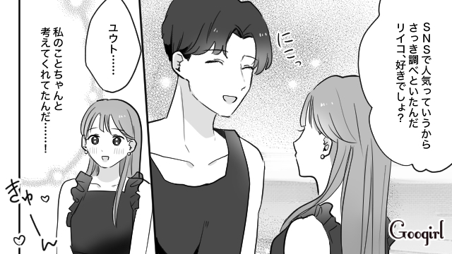 結婚を見据えて交際中のユウトは、親友のシンヤと異常なほど仲が良く、リイコはいつも振り回されています。二人きりの旅行のはずが、失恋したシンヤが現地に現れ、「別行動」を条件に同行を受け入れました。