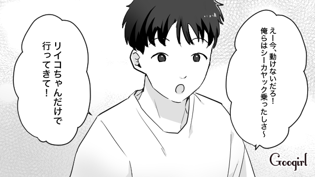 けれど新幹線では一人席、現地でも気づけば3人で行動する空気に。リイコは反対しかけたものの、ユウトの優しさを尊重し、今日だけはと気持ちを切り替えました。でもビーチに向かうと、ユウトとシンヤが2人だけでシーカヤックを楽しんでいたのです。