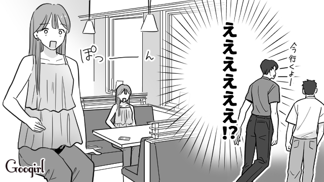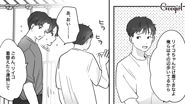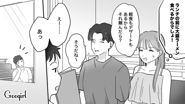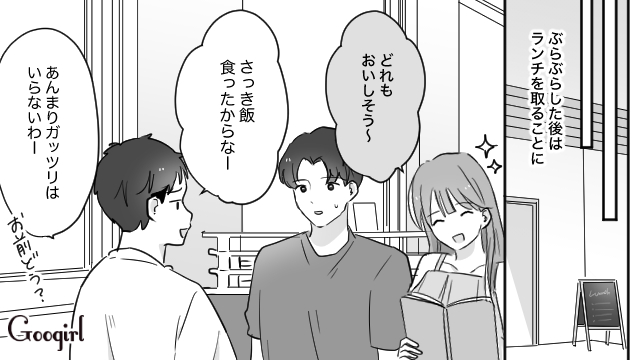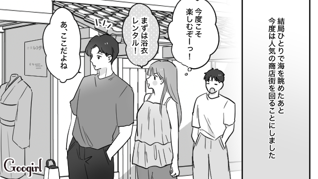 ジェラートを食べようとユウトが誘ってくれた直後、シンヤが大盛ラーメンを2つ抱えて現れました。「まだランチの予定があるのに……」と思いながらも、2人はその場でラーメンを平らげてしまいます。まだ何も楽しめていないリイコは海へ行こうと2人を誘いましたが、シンヤは「さっき遊んだから海はいい」とあっさり断ってきたのです。