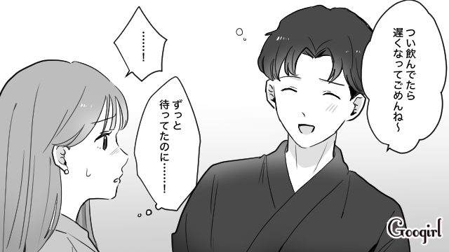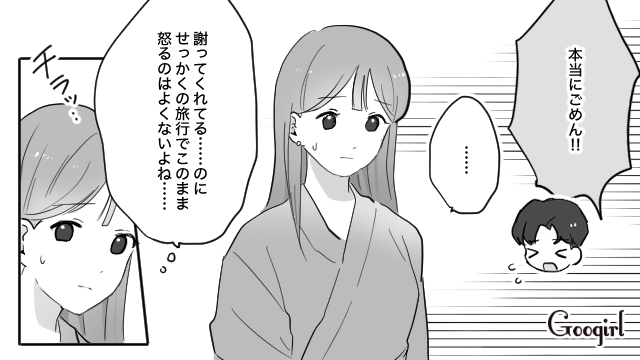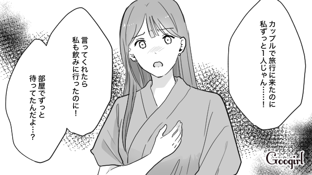 彼氏のユウトと2人きりの旅行を楽しみにしていたリイコでしたが、親友シンヤが同行し思い通りになりません。取り残されたランチも味気なく、寂しさを募らせます。ホテルで謝るユウトに優しさを感じ、「きっと2人きりの時間もある」と思い直した直後にシンヤが現れ、ユウトを風呂に誘っていきます。露天風呂の後ゆっくりしようと約束したのにもかかわらず、またユウトはシンヤとハッピーアワーを2人だけで楽しんでいたようで……。