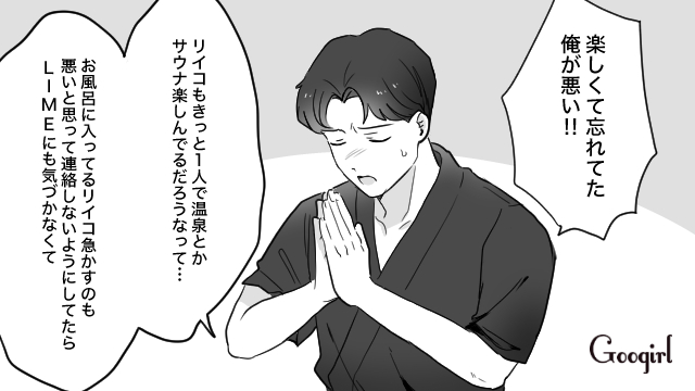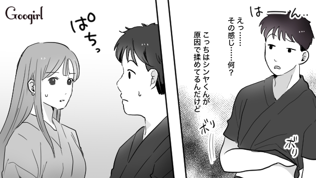 ▽ サウナのあと、2人でお酒を楽しんでいたと悪びれもしないユウトとシンヤ。さすがに「連絡くらいできたはず」とリイコは怒ります。ユウトは平謝りし、リイコも許すしかない空気に。ふとシンヤを見ると、元凶のくせに面倒くさそうな態度。リイコがその様子に気付いた途端、シンヤは大げさに謝ってきました。