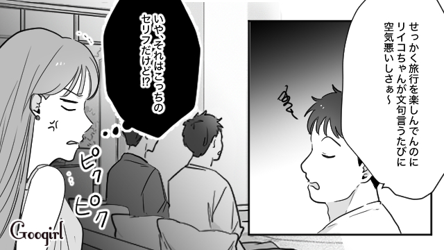 彼氏のユウトと2人きりの旅行を楽しみにしていたリイコでしたが、なぜか親友のシンヤが同行することに。ホテルで3時間別行動して悪びれもしない2人に「せめて連絡くらいできたはず」と怒るリイコでしたが、ユウトは平謝りし、結局は許すしかない空気になりました。