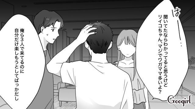彼氏のユウトとの旅行を楽しみにしていたリイコでしたが、なぜか親友のシンヤが同行することに! 自由行動ばかりで振り回され、ホテルでの3時間の別行動にもユウトは無反応。食事に出かける直前、シンヤの行き過ぎた発言にもユウトは笑って流し、「別れちゃえよ」と言われても否定すらしませんでした。