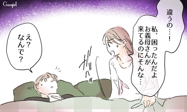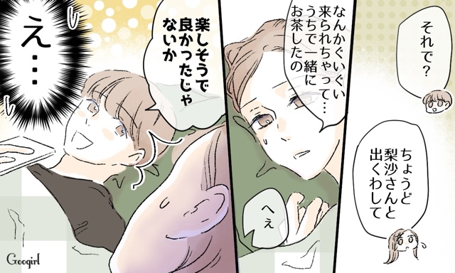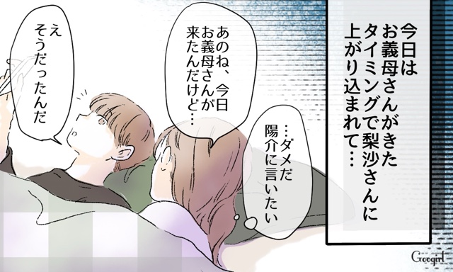 義母の訪問に出くわした梨沙は、図々しくまた家に上がり込んできました。しかも子どもマウントまでしてきました。さすがに菜月は我慢したくないと陽介に話しますが……。