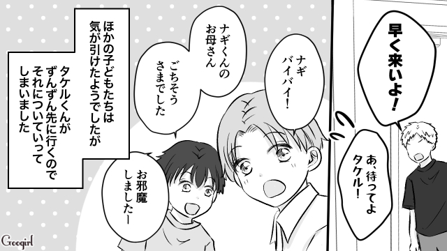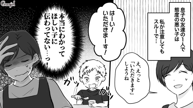 仲の良い友達がいるのはママとしてうれしいですが、やってくる友達は、しっかり躾をされている子どもばかりではないことも……。真奈美は小3の息子がいるママ。息子・ナギの友達の中には、少し困った子ども・タケルがいます。タケルは家に来ても、おやつを出しても、挨拶ナシで……。