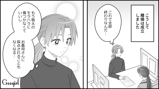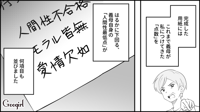 義家族との関係や距離感は難しいものですね。なにかと口を出しがちなタイプの義母も存在します。嫌味や文句ばかり言われたら、もちろん嫌ですし、それが点数化されるような形だったら、「人を採点できる身分!?」とでも言いたくなりますね! 秋奈の義母は嫁を点数化して評価してくる人で、夫の敬太も母親の肩を持ってばかりです。離婚を決意した秋奈は行動を開始。証拠を集め、今まで受けた被害をまとめ……ついに話は最終面談へ!