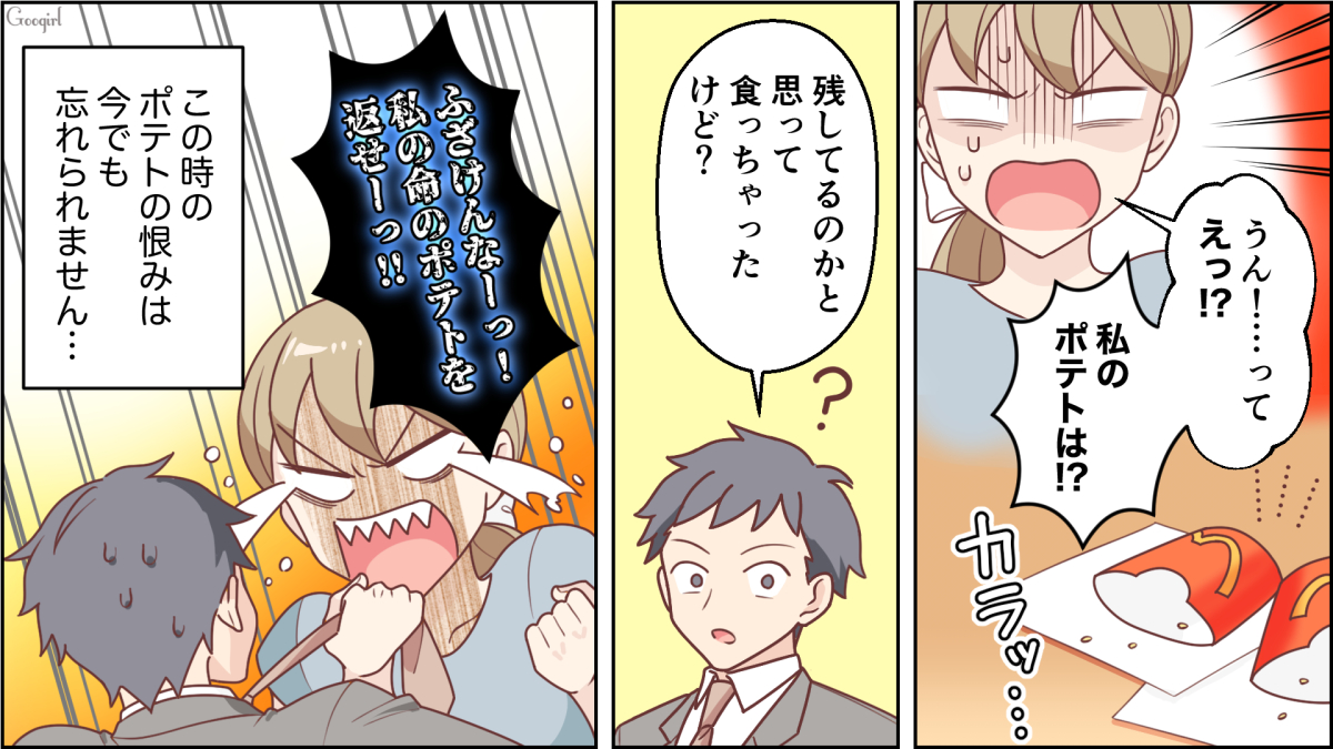 ▽ 悪阻がヒドいと食べられる物が限られる人もいますよね。そんな生命線のようなポテトを食い尽くしてしまうなんて……。一生この恨みは忘れられませんね!!