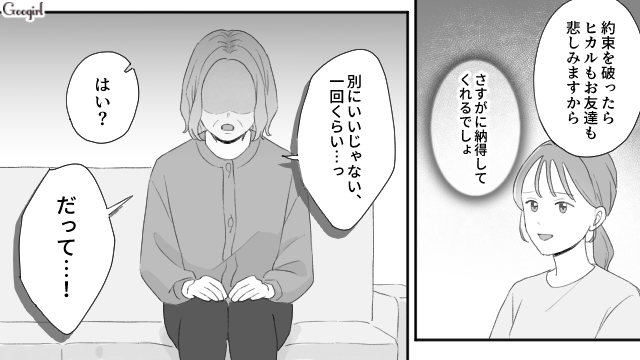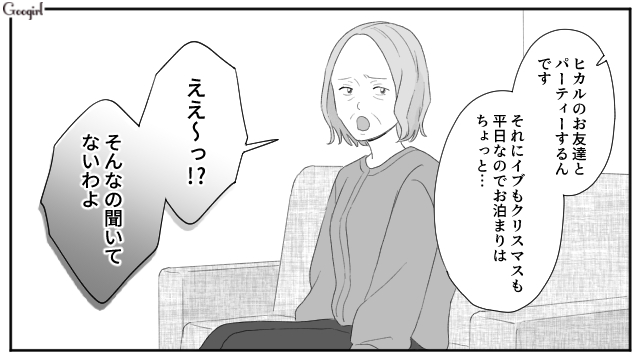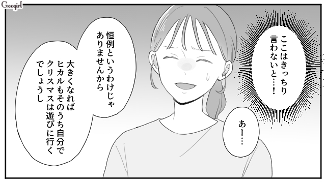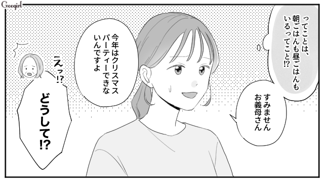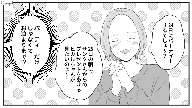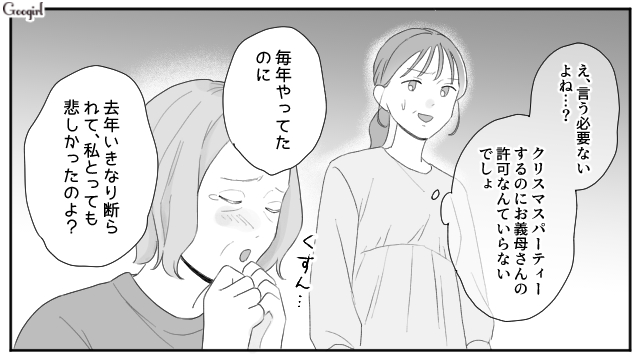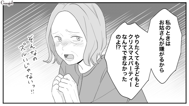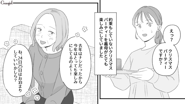▽ 平日だというのにお泊まりの提案までしてくる義母に、毎年恒例と決めていたわけでもなく、さらに娘は友達と約束しているからクリスマスパーティーはできないと断固断り続けるミナミ。けれども義母はただズルい、とごねつづけます。