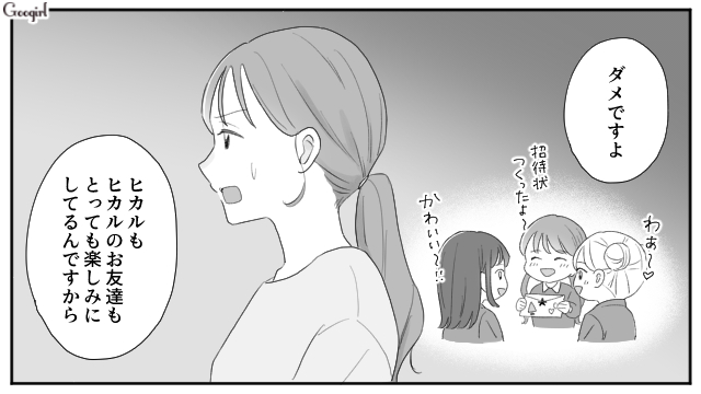 1人娘のヒカルを育てるミナミは、毎年恒例のようになりつつある義両親とのクリスマスパーティーについて悩んでいます。夫アキヒロに相談し、家族水入らずでクリスマスパーティーを過ごせることに。そして1年後、5歳になったヒカルはお友達とクリスマスパーティーを計画していましたが、遊びに来た義母は、約束もしていないのに、クリスマスパーティーが楽しみだと言い出しました!