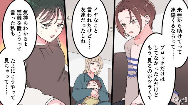 ▽ 義母が子どもを育てると宣言された未亜ですが、不満を持ちながらも何とか子どもと一緒に生活しているようです。真由には子どもが生まれて、百合にも子どもができていました。かつて縁を切った未亜への怒りは薄れ、未亜がいつか自分で気づいて、幸せになることを祈る3人なのでした。未亜は幸せだけでなく友達も失ってしまったことに、気づく日が来るのでしょうか。
