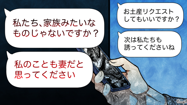 ▽ 旅行中も絶え間なく送られてくる美玲からのメッセージ。「前の夫とは違って幸せそう」「陽太さんはかっこいい」と、内容は徐々に常軌を逸した羨望へと変わっていきます。さらに、美玲の魔の手は夫の陽太にも。妻に隠れて陽太が受け取ったメッセージには、「次は私たちも誘って」「私も妻みたいなもの」などと、ゾッとする言葉が並んでいました。