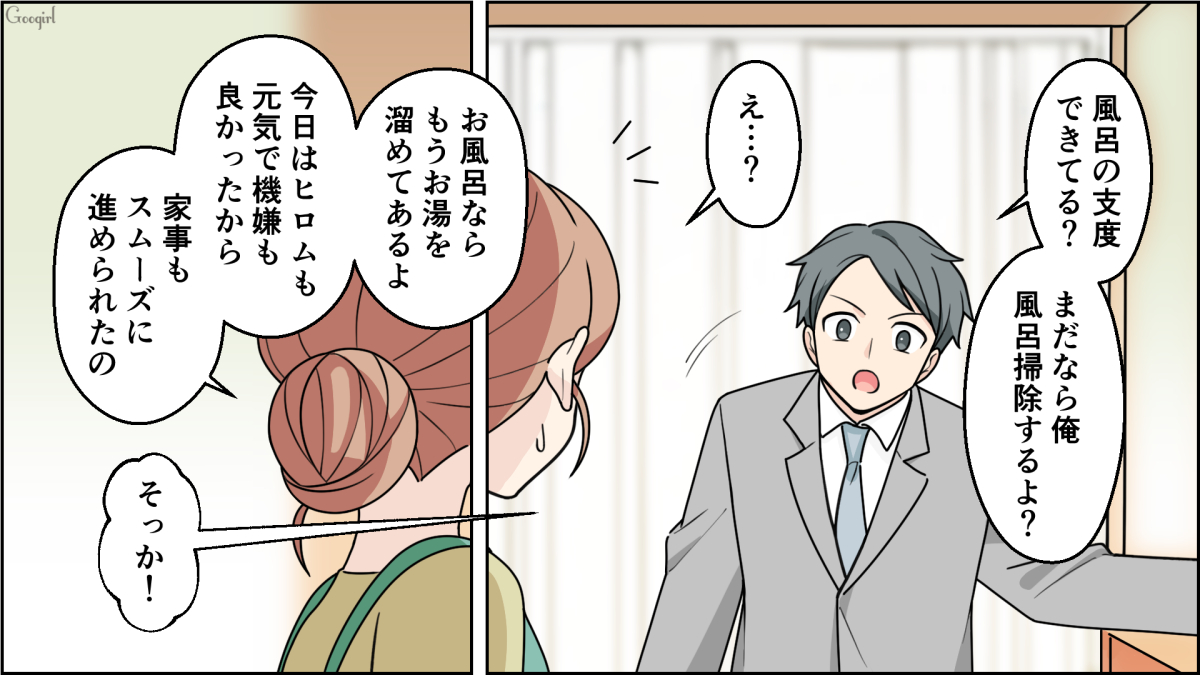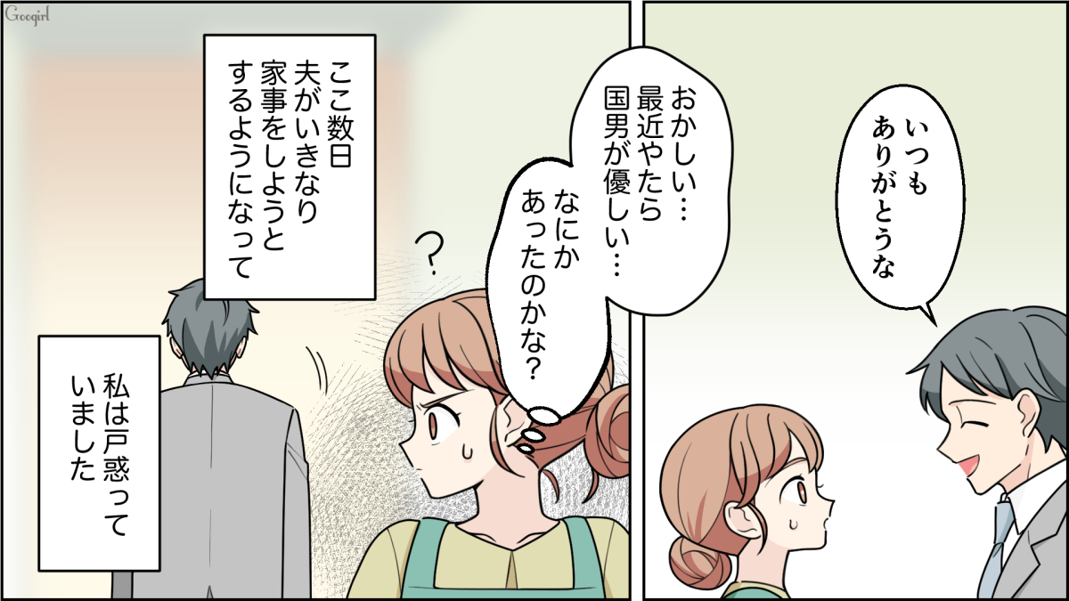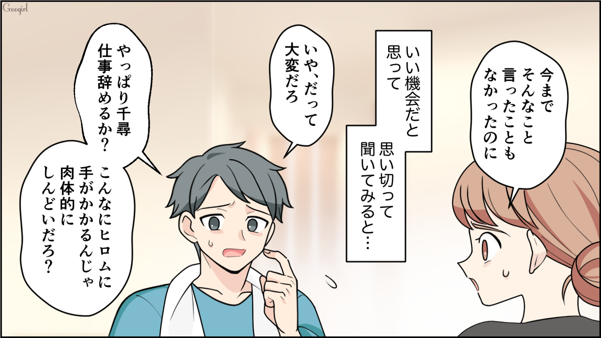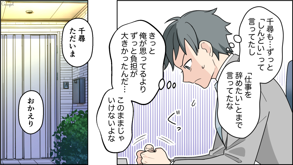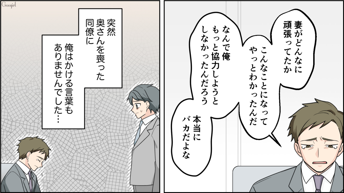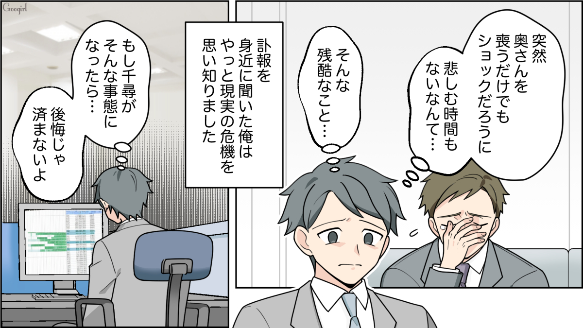 千尋と国男は、2歳の息子を持つ夫婦。時短で働きつつ育児をするのを負担に思う千尋は、ついに直接つらい現状を訴えましたが、国男は楽観的です。でもあるとき、国男の同期の奥さんが急死します。同期から話を聞いた国男は……。