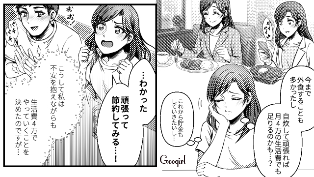 結婚後の生活費の取り決めは問題が起こりがちですよね……。今は何でも値上げラッシュで贅沢をしなくても生活費はかさみがちです。今回は生活費4万を提示され、夫に現実を突きつけたエピソードの第1話をご紹介します!