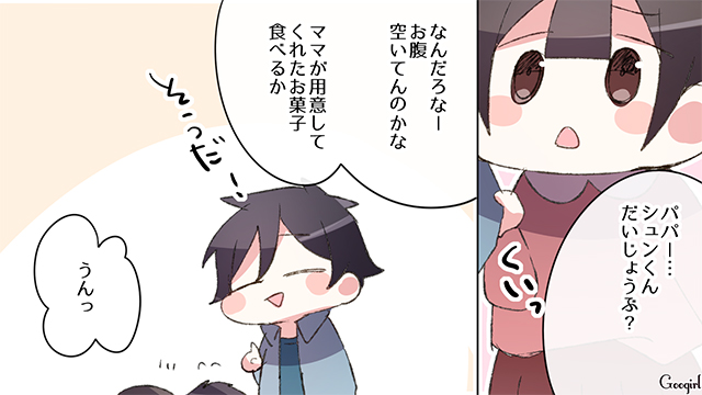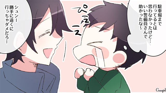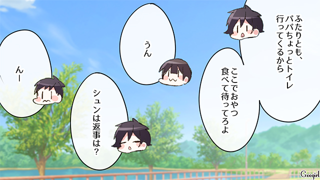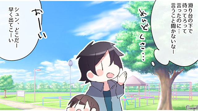 陽平は、ユイの滑り台に付き合っている間に、シュンを見失ってしまいました。1歳半の我が子がいなくなったにしては、呑気な陽平ですが……。大丈夫でしょうか?