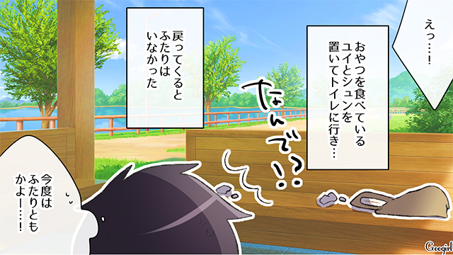ベンチに子どもふたりを置いてトイレに行った陽平。戻ってくると、ふたりともいなくなっていて……。まだ3歳と1歳半の小さな子です。普通なら真っ青になり心配するところですが……。