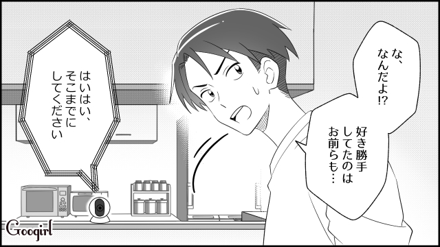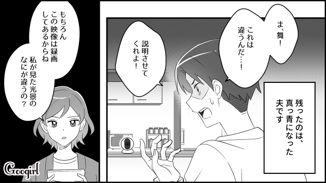 舞は4か月の娘を育てるママ。でも夫の勇人は身勝手な性格です。あるとき舞は、実家から飼い猫の様子を確認するためにペットカメラを起動します。すると勇人が同僚を家に連れ込み、好き勝手に過ごしていました。ついに舞は反撃を決意。カメラ越しに声をかけました!