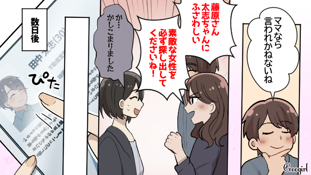 ▽ マザコンの太志に、クセの強い美佐江……。結婚相談所の藤原も手を焼いているようです。そんな太志の危うさにまったく気づかずにお見合いをし、気に入られてしまった麻里。彼女の運命やいかに……!?