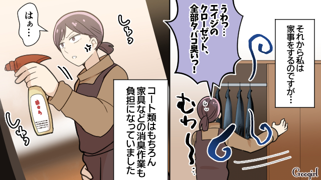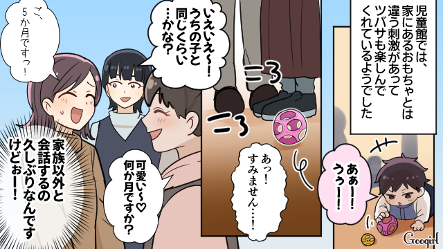 ▽ タバコを吸う暇があるならオムツくらい替えられそうですよね……。毎日の消臭作業もシホの負担が大きくて大変そうです。しかし、児童館でいい出会いもあったようですが……?