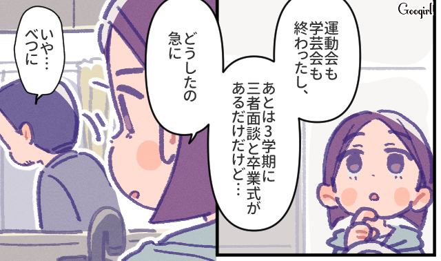 幼稚園や小学校の行事に参加しない旦那さん。周りは夫婦で参加している保護者の人が多いのに、毎回一人で参加していると虚しい気持ちになることも……。今回は「『卒業式にだけ来るんだ?』普段無関心な父親に娘が言い放った一言」第4話をご紹介します。