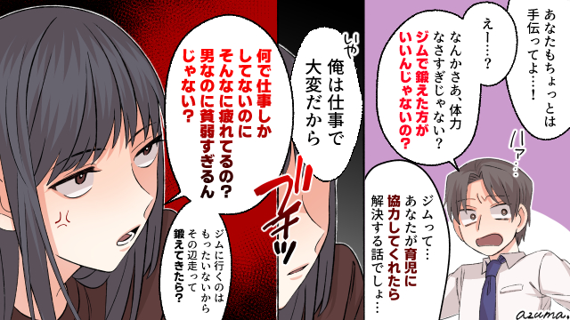 夫に『もっと協力してほしい』と言ったら『そんなに体力ないなんて、ジムで鍛えたほうがいいんじゃないの?』『筋トレしたら?』なんて言ってきて……。『どこにジムに行く時間と体力があると思ってるの?』『あなたがもっと育児に協力してくれたら解決する話なんだけど?』そう言ったら、夫は『俺は仕事で大変だから』と言ってきました。