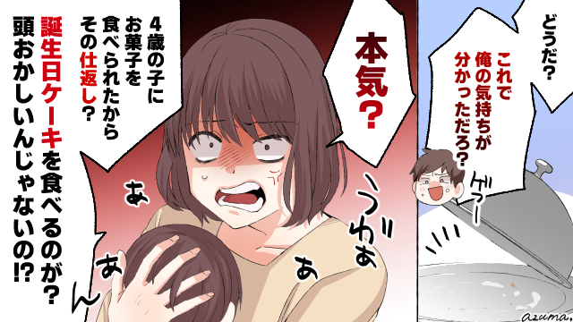 ▽ せっかくの誕生日に子どもにトラウマを与えるようなことをして、許せるわけがありません。親になるということは「与える側」になるということ。「子どもにお菓子を取られたから復讐する」なんて、普通は思いつきません……。