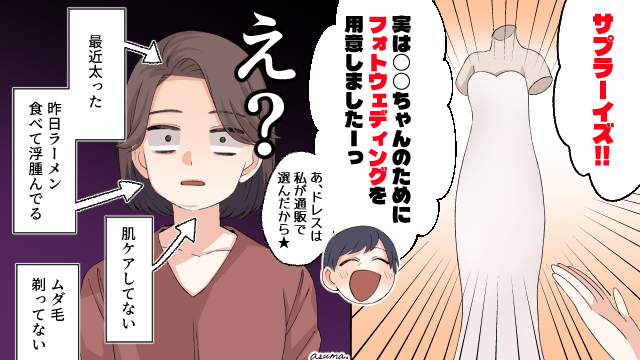 ▽ 一生に一度の写真なのだから、メイクもドレスも自分の好きなものにしたいと思うのは当然のこと。しかも、お嫁さんの両親不在のフォトウェディングって、一体どういうつもりなのでしょうか……。サプライズプレゼントといわれても、まったくうれしくありません……。