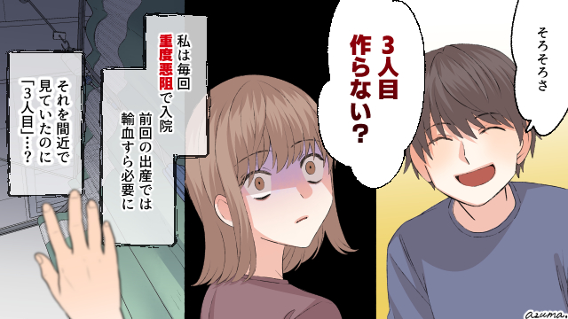 「夫から『3人目が欲しい』と言われました。私は重症悪阻で毎回入院しているし、前回の出産は難産で出血多量に。輸血までして生死をさまよったのに、夫は笑顔で3人目を要求してきたんです。私の体はまだ回復していないのに『産んだら出産の大変さなんて忘れるんじゃないの?』なんて言ってきて。