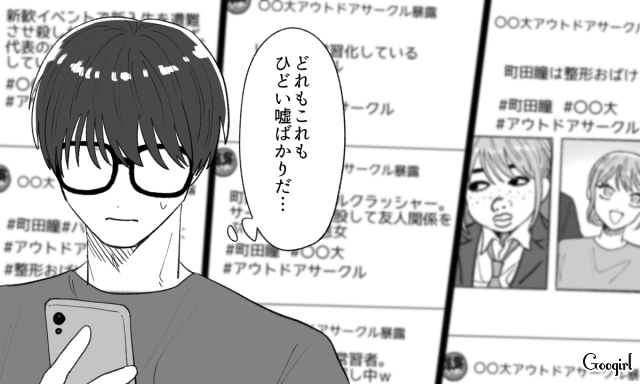 苛立った斗真はなぜか瞳と由史を逆恨み、SNSに誹謗中傷コメントをします。さらに瞳が3股をかけていたと嘘をつき、校内に悪い噂が流れはじめました。アウトドアサークルの暴露アカウントにもデタラメが投稿され、瞳は斗真の仕業ではないかと考え、由史に相談します。怯えた学校生活を送る瞳とは対照的に、斗真は企業から内定をもらったのでした。