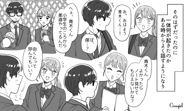 教室で見るホンワカした雰囲気とは対照的に、部活では熱心に柔道に励んでいた由史。一方の瞳も、そのギャップに惹かれて由史を目で追うようになっていたのでした。そんな二人の馴れ初めを回想して、瞳を大切に思う気持ちをより深めた由史なのでした。